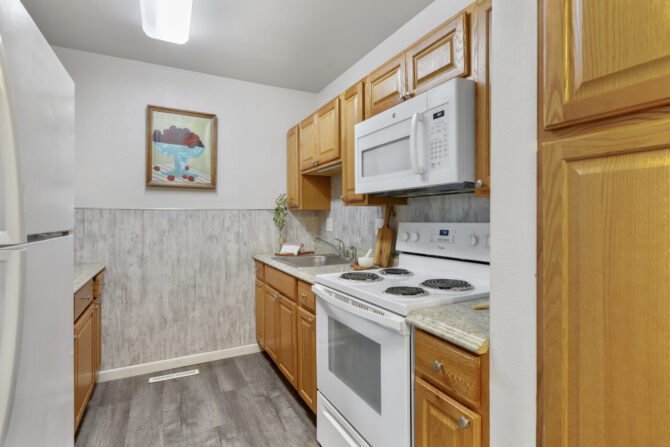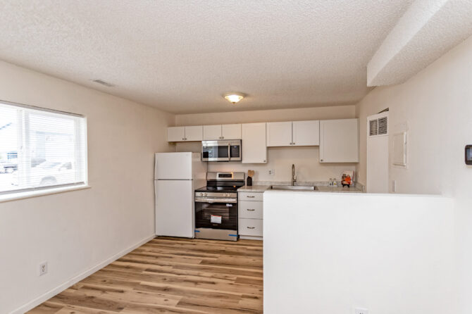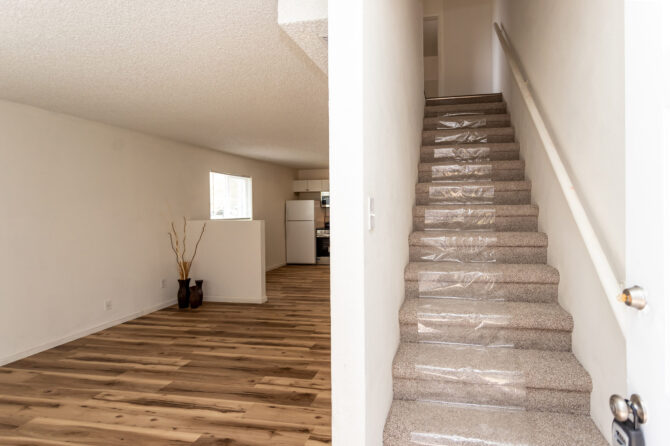 Havens Homes purchased this apartment building in April 2025 and successfully converted it to a condominium in June 2025.  It consists of four identical two-story condos, each with two bedrooms, one bathroom, and a large private backyard (easily big enough for a trampoline or swingset).  The building was constructed in 1987 and was beginning to show its age, so Havens Homes went to work – installing new flooring, new kitchen cabinets and appliances, new bathroom plumbing and vanities, new energy-efficient windows throughout the entire building, and a new fence with four gates for each of the backyard spaces.  We also repainted the exterior and replaced a small amount of damaged siding.  As you can see from the photos, these condos now look like new!